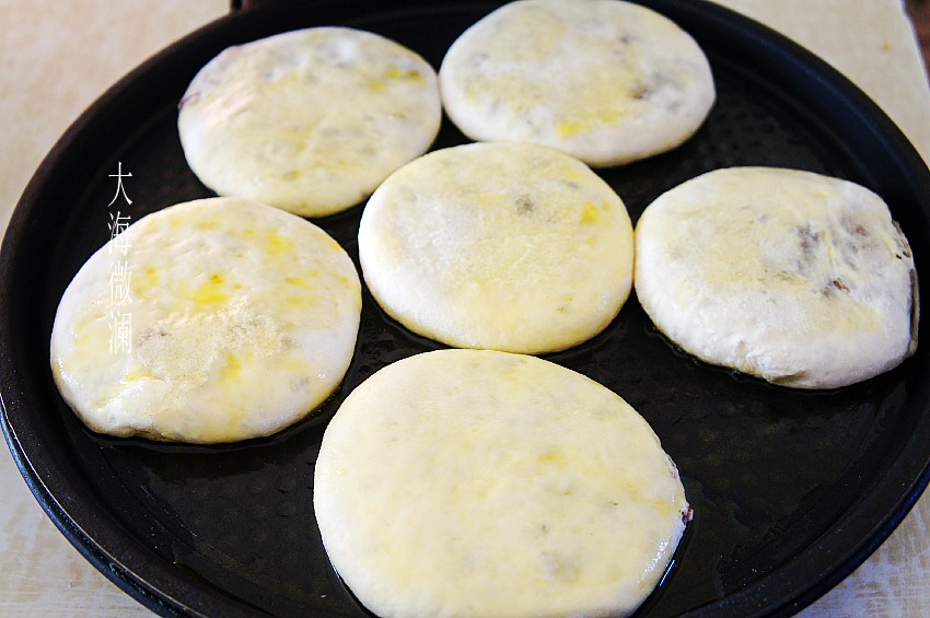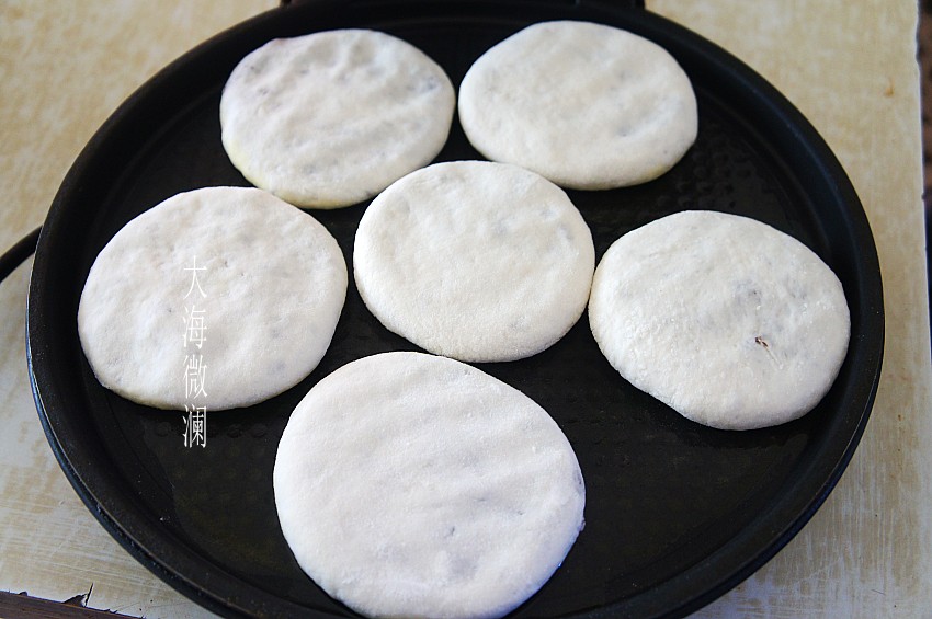 上面也薄薄地刷层植物油,盖上上盖中火烙,3分钟左右就烙好了,因为豆馅是熟的,只要饼皮熟了就好。