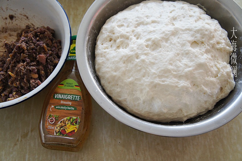 准备食材:适量的温水(不烫手,体温差不多)中加入酵母融化,然后加入面粉中搅拌成絮状,揉成面团盖上保鲜膜,温暖处发酵。若早餐吃,前一天晚上和面,可放入冰箱冷藏发酵。豆馅是邻家姐姐送来的,自制红薯豆馅,很有特点,口感好,既甜糯又有豆粒的清香,还有嚼头。