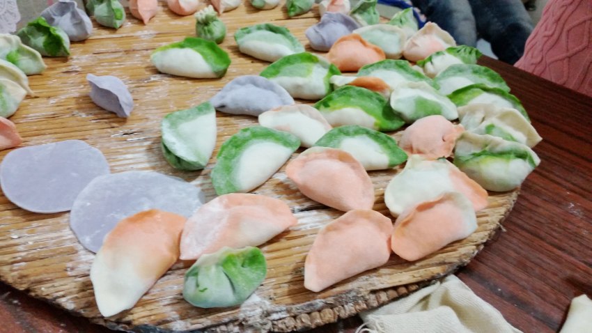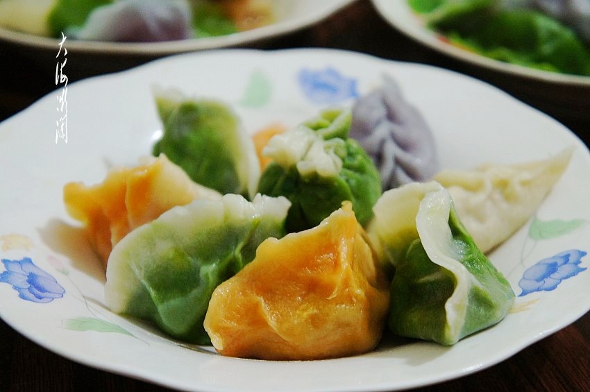 5、包饺子:各种颜色的面团可以分开包,也可以将其中一种颜色包上另一种颜色,比如绿色包白色,包出来就是翡翠饺子。面团揉成长条,均匀的切成小剂子,擀成皮包馅捏成饺子。