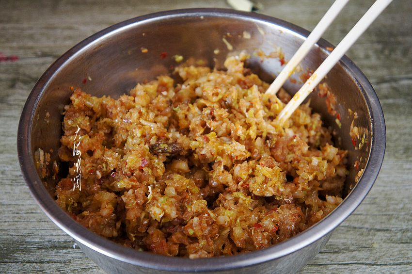3、白菜洗净切碎,撒点盐腌制10分钟左右,然后攥掉水分,加入到肉馅中,搅拌均匀。