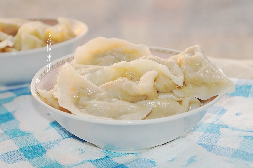 5、煮饺子:我习惯这样煮,锅中加入适量的水,水开下入饺子,煮开浇点冷水,再煮开再次浇点冷水,第三次煮开关火,捞出,饺子煮的恰到好处。OK!开餐啦!