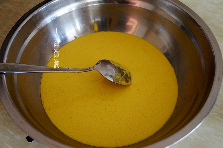 搅打至无颗粒的糊状,搅打好的小米蛋黄糊倒入搅拌盆中备用。