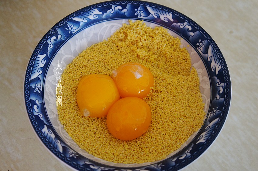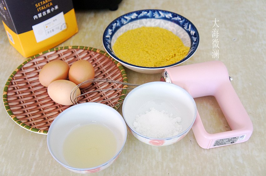 准备食材:黄小米淘洗干净,提前浸泡6小时以上,然后控净水分。鸡蛋选择大个的,备好白糖和玉米油。