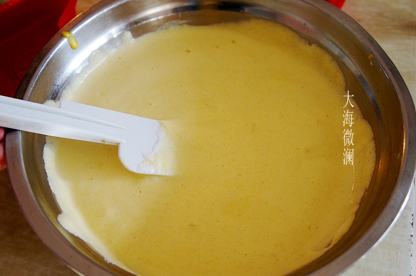 分三次将打发的蛋白霜加入到小米蛋黄液中,以“之”字形切拌均匀。