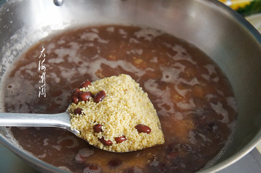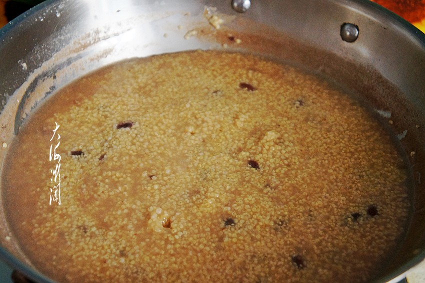 下入浸泡好的大黄米,中小火开锅煮,不要盖锅盖,边煮边用铲子搅拌,避免糊锅。