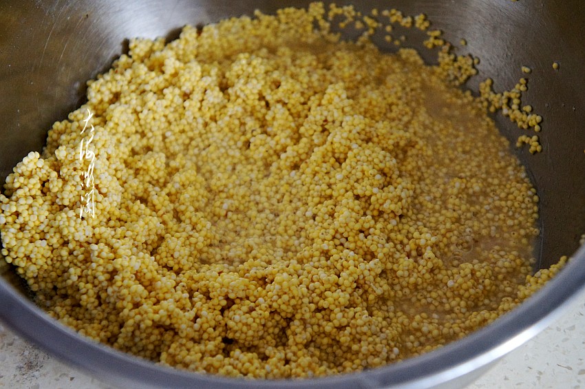 烧一壶开水,倒入到淘洗干净的大黄米盆中,浸泡2个小时以上,浸泡过后的大黄米更加粘糯,而且还容易煮熟。