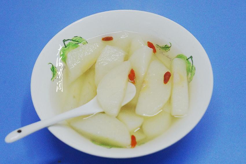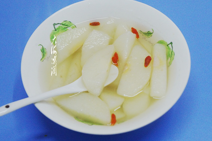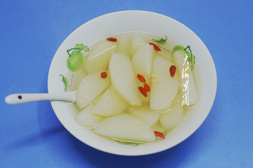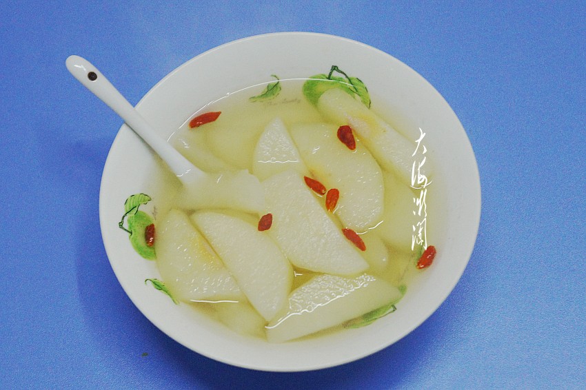 【冰糖雪梨汤】所需食材:雪梨2个;冰糖适量;枸杞子适量。