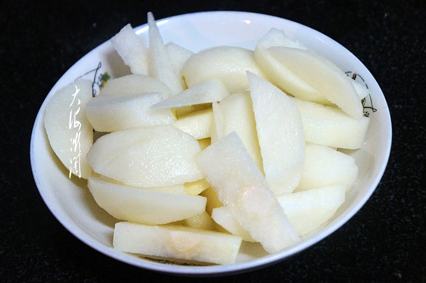 雪梨去皮洗净,根据自己喜欢的形状切块。