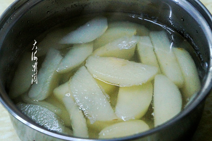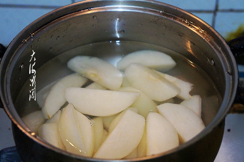 汤锅中加入适量的水,下入梨块,大火烧开,小火慢炖。