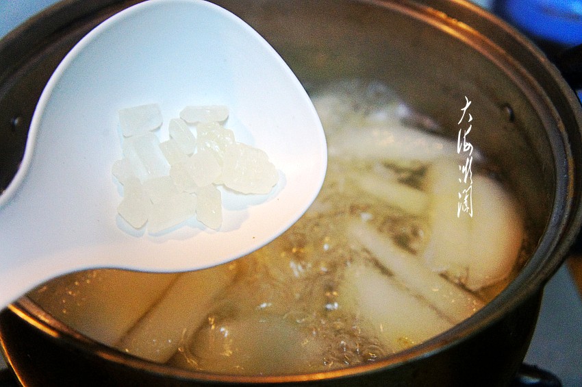 炖至梨块变软,根据自己喜欢的甜度,加入适量的冰糖。冰糖的用量随自己喜欢的口味添加,冰糖可以起到生津止渴、润肺止咳的作用。