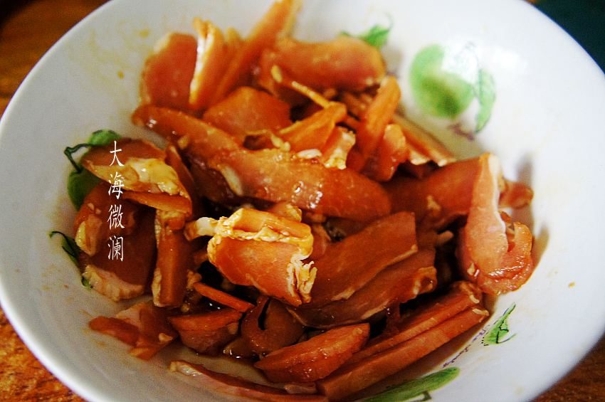 解冻后的猪肉切片,加入料酒、生抽腌制一下。