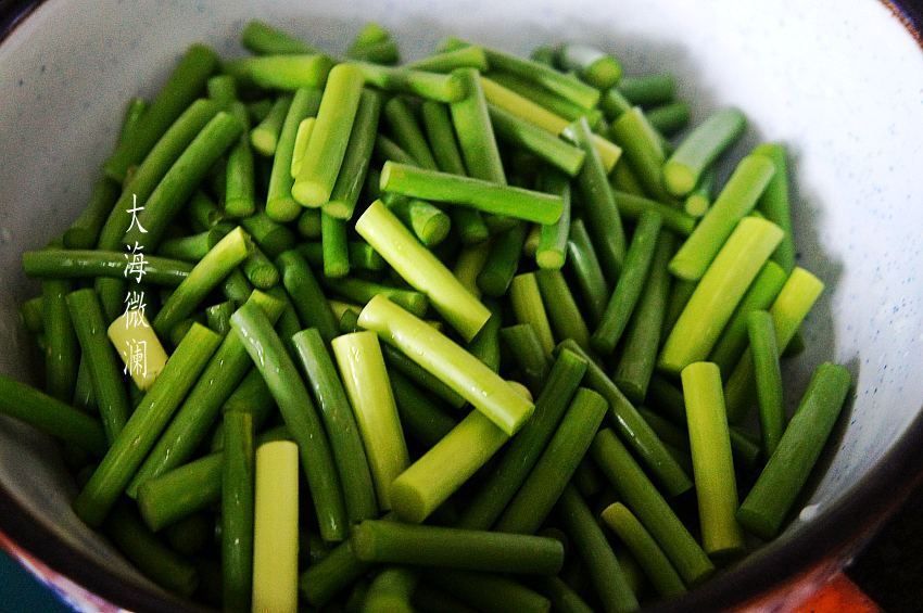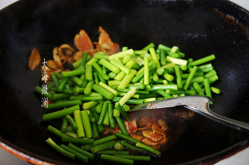 然后放入浸泡过淡盐水的蒜苔,快速翻炒。