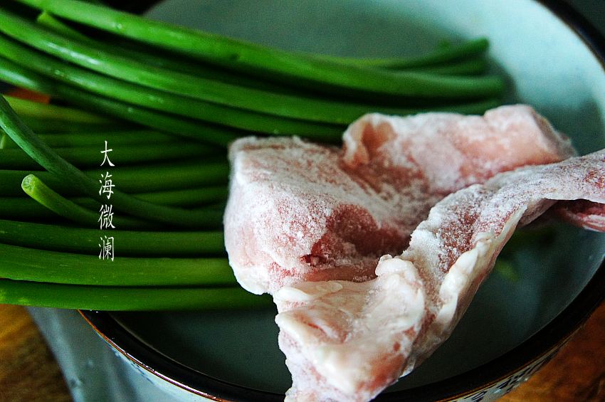 买回来的蒜薹根部切掉,尾部也都摘下来,放在淡盐水中浸泡10分钟以上,然后反复清洗干净,切段儿备用。冷冻猪肉取出解冻。
