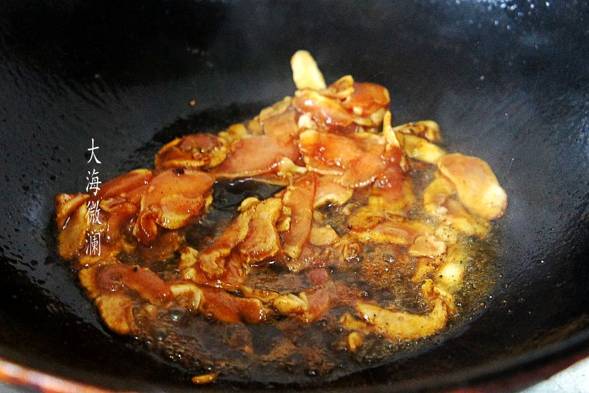 炒锅加入适量的油,先下入腌制好的猪肉和姜丝翻炒,不喜欢姜丝的朋友可以选择不放。