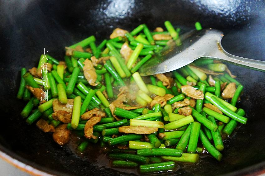 重点来了,此时淋上小半碗水翻炒。这个小技巧看似简单,却非常关键,不但能使蒜薹颜色翠绿,还能改变蒜薹的口感,使其脆嫩爽口。