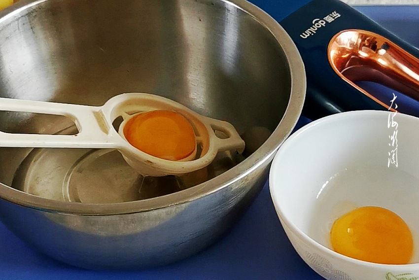 准备两个无水无油的碗或者盆,把蛋清蛋白分离,分别放入两个碗中,并把蛋黄扣起来或者用盖子盖上,防止表面被风干。