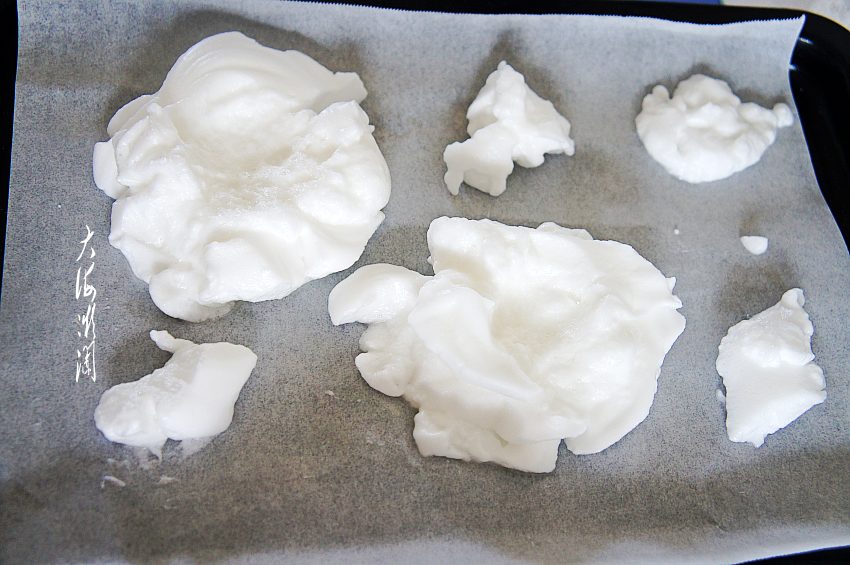 烤盘铺上油纸,放入打发好的蛋白,整理成云朵形状,中间挖个坑。