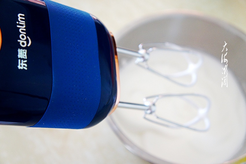 蛋白中加入少许柠檬汁,使用东菱无线打蛋器将蛋白打发至起大泡,加入白糖继续打发,注意打蛋器要提前充好电,新打蛋器也是带电来的,但是电量不满,最好充满后再使用。这款打蛋器小巧精致,无需电源插座,使用灵活,双棒打发效果非常好。