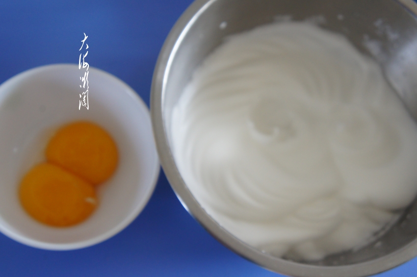 蛋白打发至出现大的纹路不消失,也就是提取蛋白有一个硬挺的尖勾就可以了。大约2分钟左右打好2个蛋清,声音很小,手感很舒适。