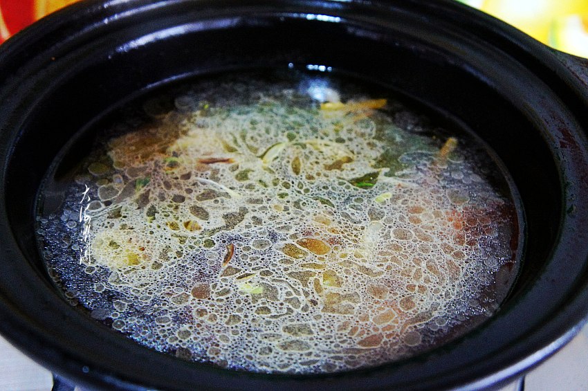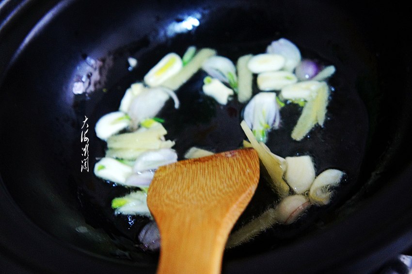 砂锅加入适量的橄榄油,爆香葱姜蒜。煲汤用砂锅最好,小火慢功,受热均匀,保温性又好,做出来的汤羹非常美味。