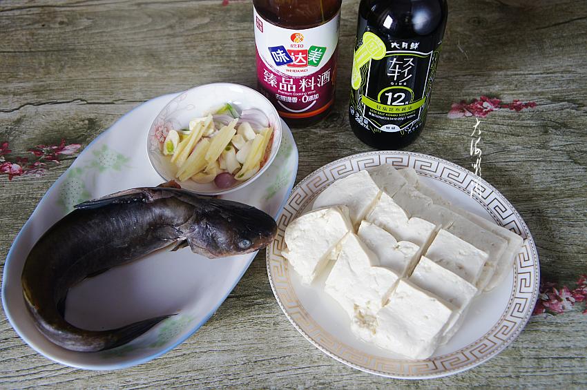 葱、姜、蒜去皮洗净切片切丝,北豆腐切片,还会用到料酒和轻酱油。