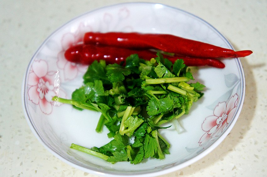 准备点香菜,洗净切碎,备两个小米椒,北方人不能吃辣,所以就不要断开,能吃辣的可以切小段。