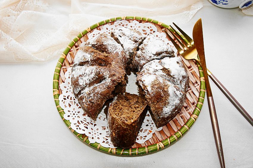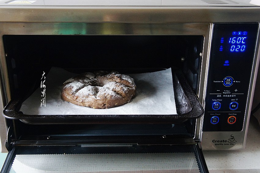 时间到,二次发酵完成后取出烤盘,烤箱先160度预热5分钟,预热期间将发酵好的黑麦面包用锋利的刀片割出自己想要的花纹,表面筛层面粉装饰一下。放入预热好的烤箱,中层,上下火160度,烤25分钟左右,烤箱的功率不同,时间和温度都有差异,需要按照自家的烤箱设置。