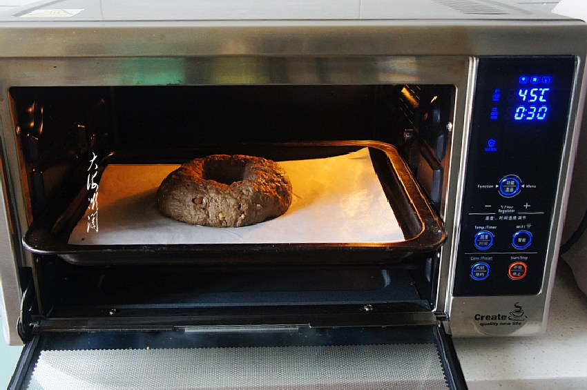 烤盘送入烤箱进行二次发酵,烤箱里要放一碗热水,让烤箱保持一定的湿度。烤箱设置45度30分钟,具体的时间要根据个人的烤箱设置。
