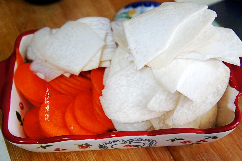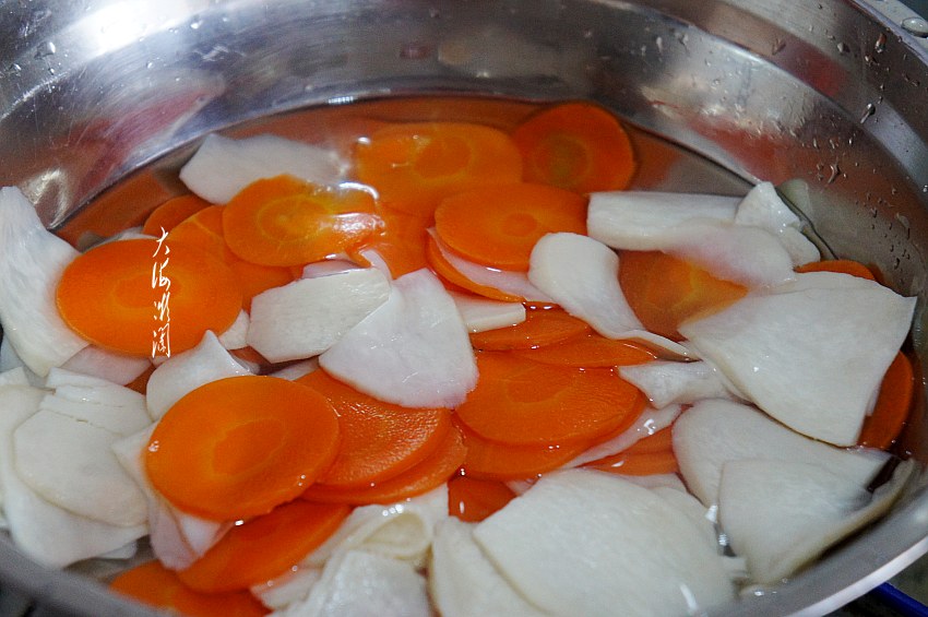 胡萝卜切片,如果胡萝卜比较细就斜切片,杏鲍菇纵向切片,最好能带出尖尖角来。