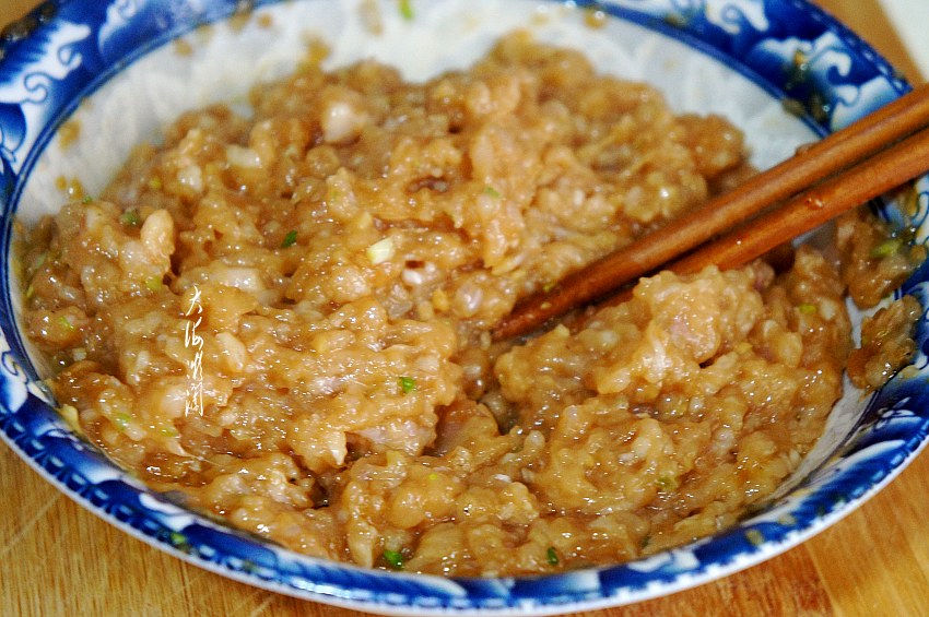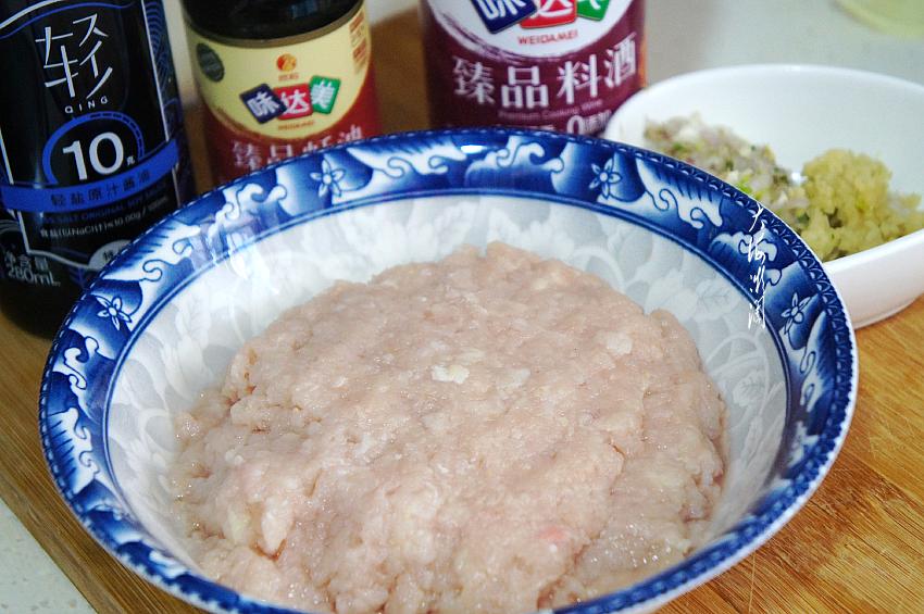 拌馅:肉泥中加入葱姜碎、1勺调和橄榄油,1勺味达美臻品料酒,1勺六月鲜轻盐原汁酱油,1小勺味达美臻品蚝油,1勺玉米淀粉,适量的胡椒粉。口重的可以加点盐。