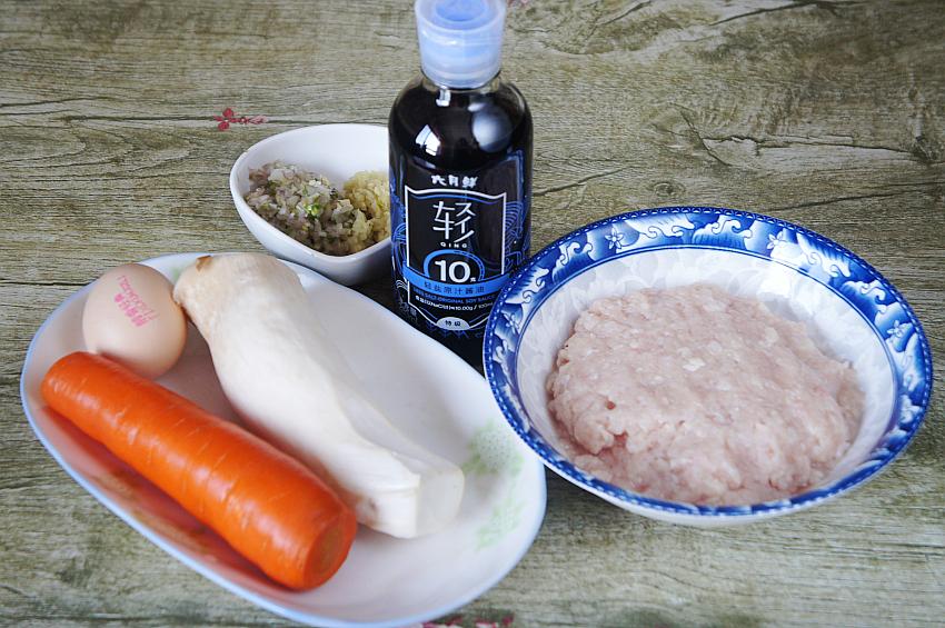 准备食材:葱姜去皮洗净切碎;鸡胸肉打成肉泥或者剁碎,胡萝卜和杏鲍菇洗净备用。