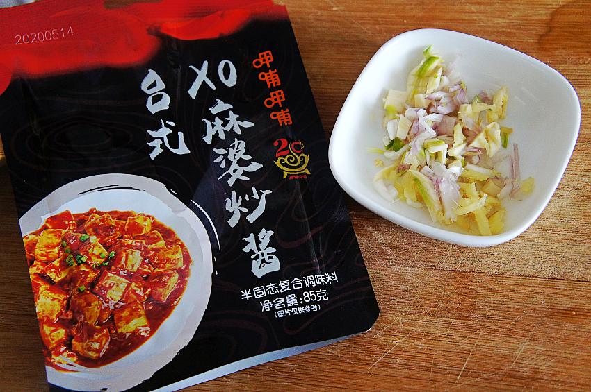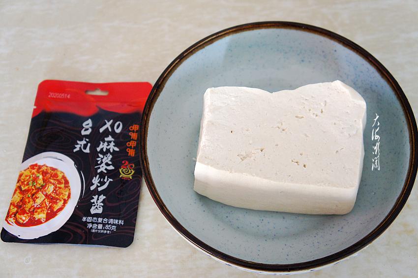 准备食材:非常简单,一包台式XO麻婆炒酱,一块北豆腐就OK了。豆腐的营养价值极高,高蛋白,低热量,低脂肪,虽然是大豆制品,由于豆腐在加工过程中加入了卤水,从而让豆腐中钙、镁的含量比大豆更高,是补充身体钙元素的营养佳品。因此,我们平时要经常吃些豆腐,特别是冬天活动较少,体内废物容易蓄积,同时大脑活动较夏天缓慢,正是吃豆腐的好时机,尤其适合老人孩子及缺钙人群食用。