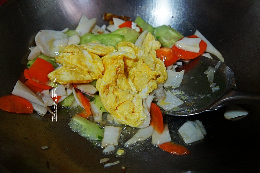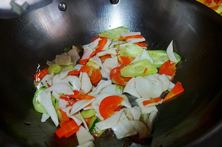 另起油锅,爆香葱花、五香粉,下入准备好的杏鲍菇、胡萝卜、黄瓜片翻炒,炒至黄瓜变色。