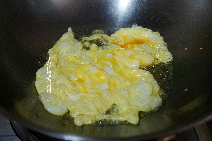 鸡蛋打散,少许加点料酒搅拌均匀去腥味。锅中加入适量的油,七成热下入鸡蛋煎至8分熟出锅,保持鸡蛋的鲜嫩。