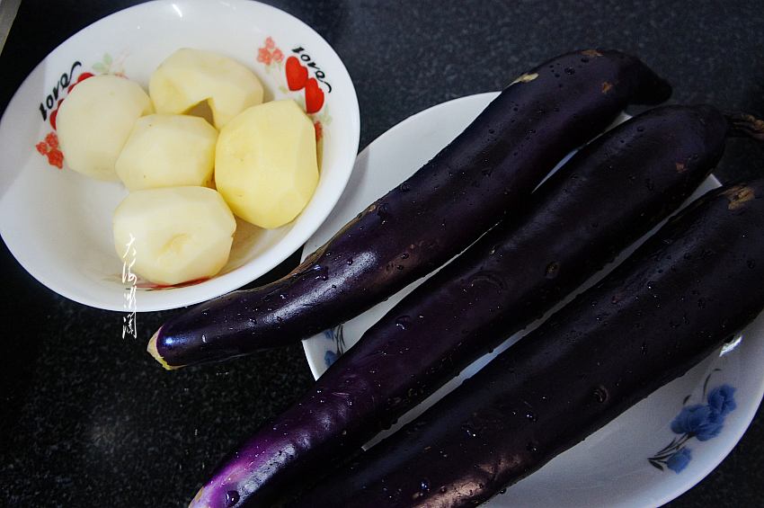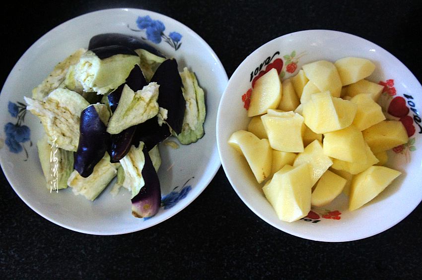 土豆去皮洗净,茄子在淡盐水浸泡10分钟左右,洗净备用。
