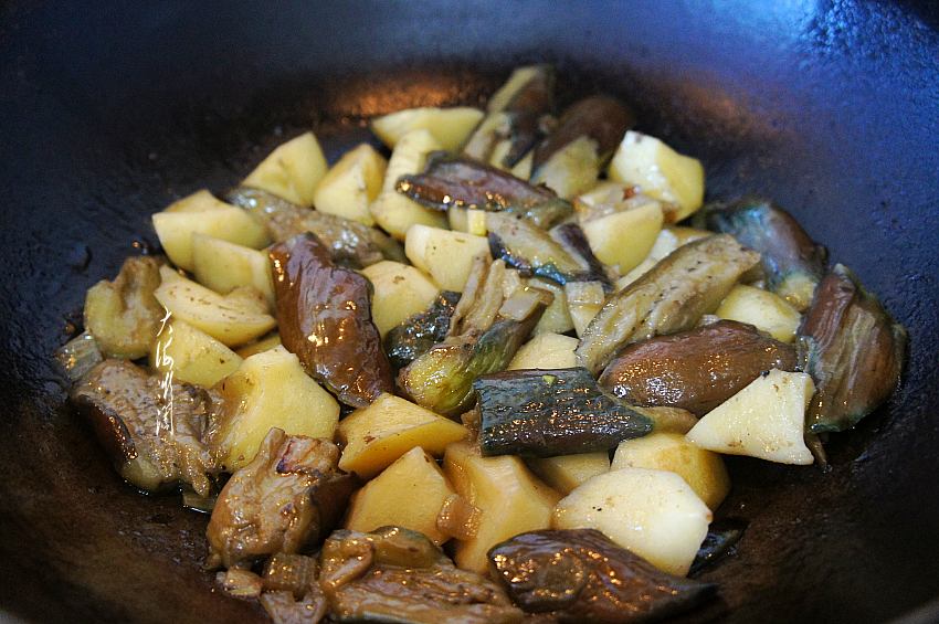 炒锅加入适量的油,爆香五香粉和葱花,加入土豆和茄子翻炒。