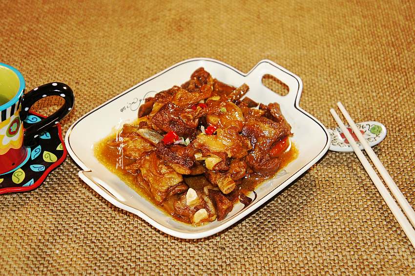 取小碗加入冰糖(或者白糖)、料酒、生抽、红烧酱油、蚝油调好酱汁,口重地加少许盐,炒锅加入适量的橄榄油,爆香葱姜,下入排骨翻炒,下入调好的酱汁翻炒上色。