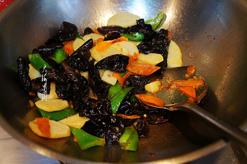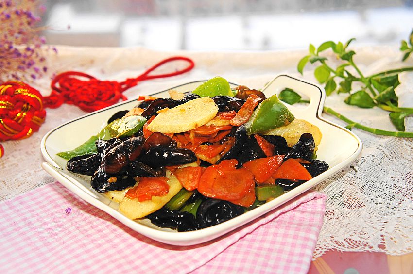 炒至五成熟,下入黑木耳和山药翻炒,少许淋点水,让各种食材熟透且口感更脆嫩。