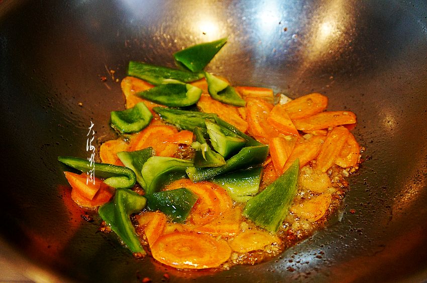 炒锅加入适量的橄榄调和油,爆香五香粉和姜末,下入胡萝卜翻炒变色,下入青椒翻炒。