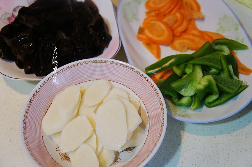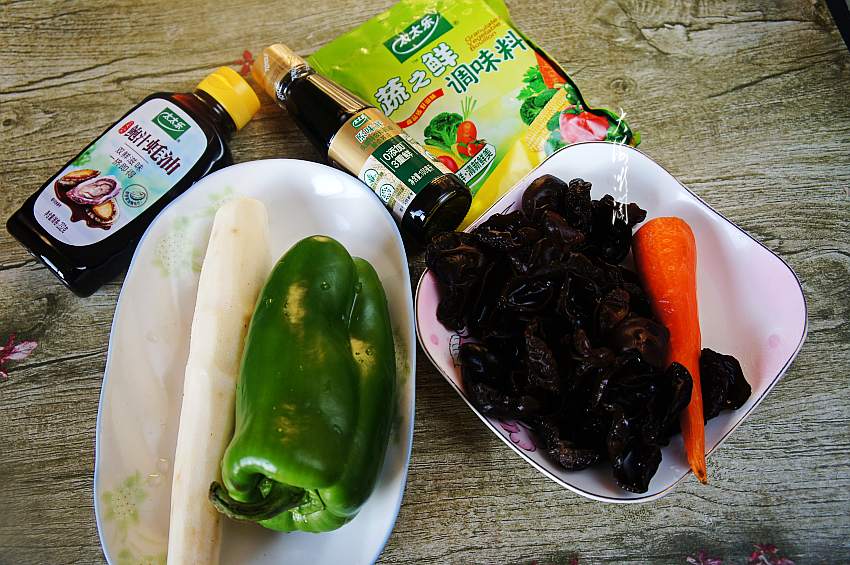 准备食材:黑木耳提前泡发洗净,胡萝卜去皮洗净,戴上手套处理山药,去皮洗净,青椒在淡盐水中浸泡10分钟,然后清洗干净。