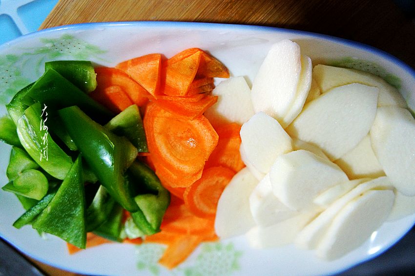 分别将青椒、胡萝卜、山药切片,山药切好片后,迅速放入淡盐水中浸泡清洗,避免变色。