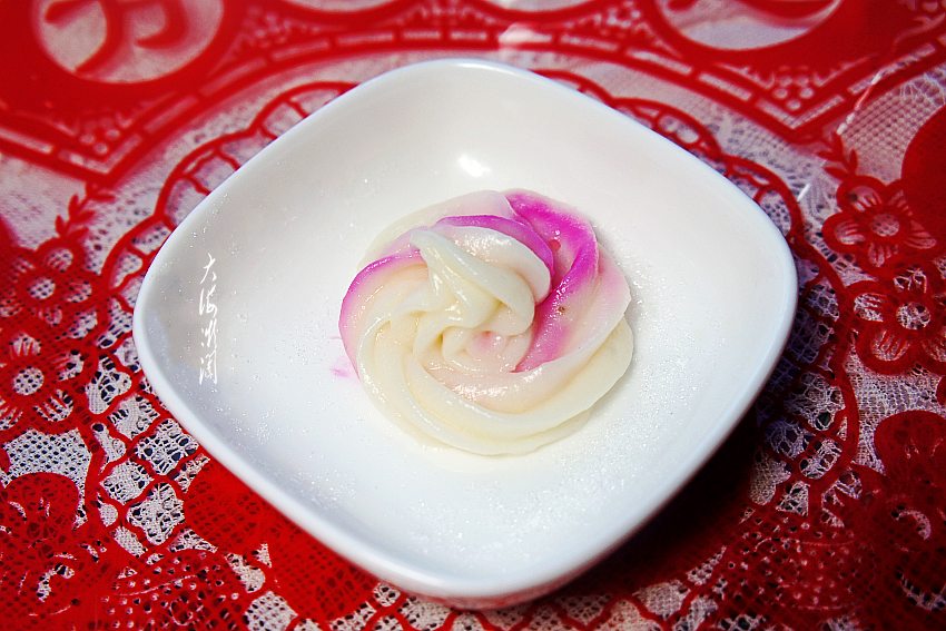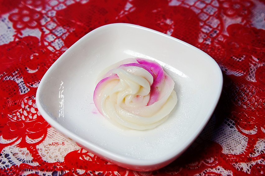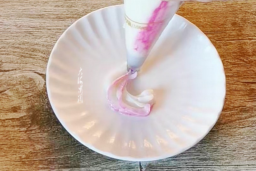 裱花袋装入一个大号的裱花嘴,我家的裱花嘴有点小了,将打好的像奶油一样的山药泥装入裱花袋,在裱花袋的边上加入适量的火龙果汁,完全用汁,不要带有火龙果籽,带有黑色的籽不好看。