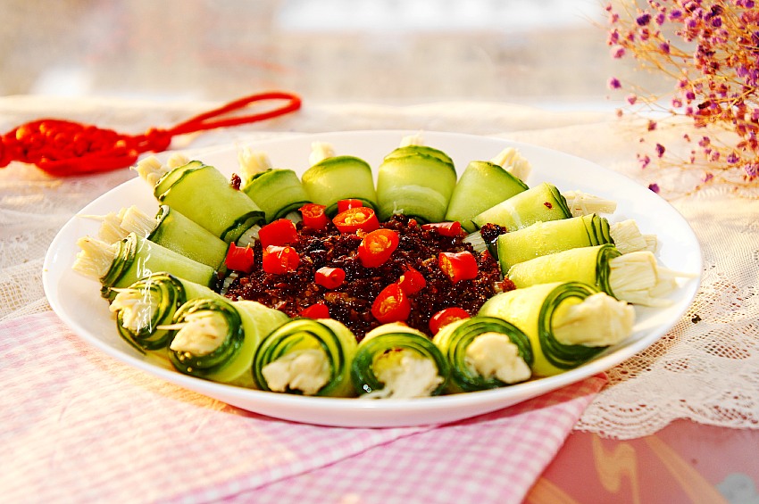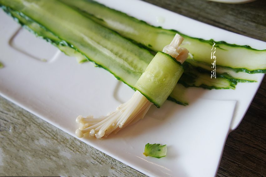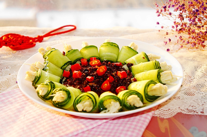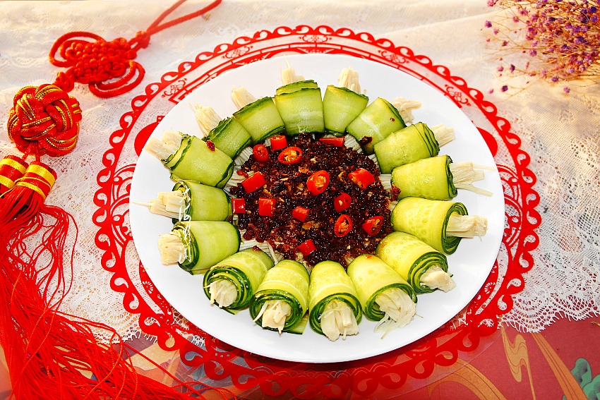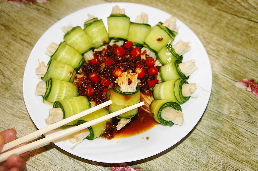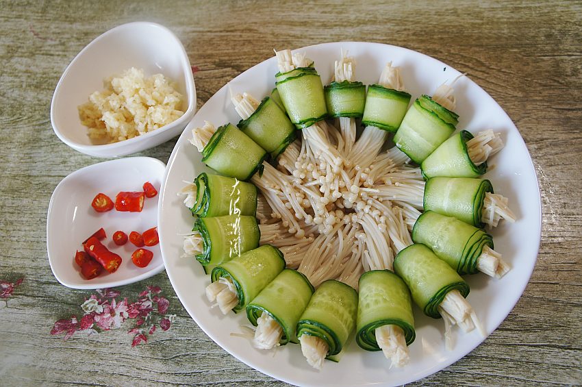 这道菜的做法非常简单,都不用动用刀哈,虽说不是徒手操作,也的确是极其简单,金针菇焯个水,黄瓜用刨皮器刮出薄片,然后用黄瓜片把金针菇卷起来,炸个蒜末一浇就OK了,厨房小白也能零失败,年夜饭的餐桌上可以提前做好,不耽误事儿。
