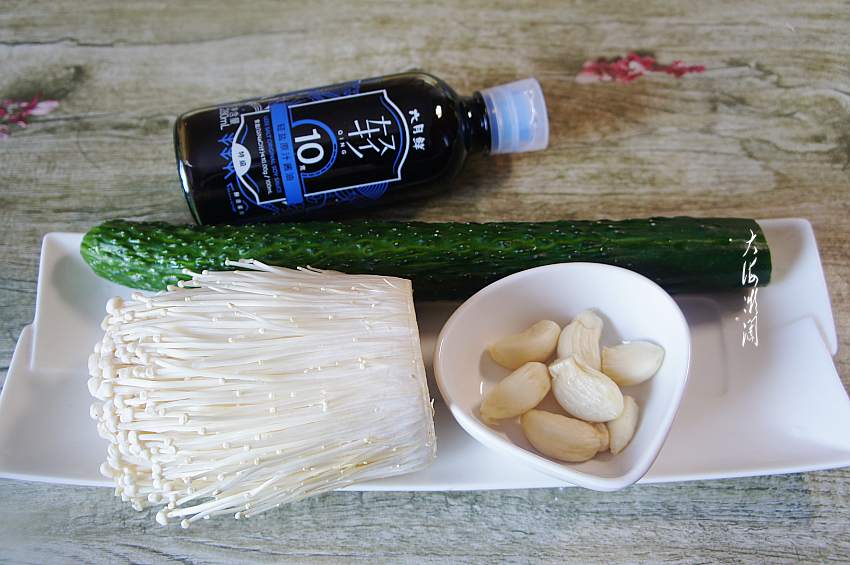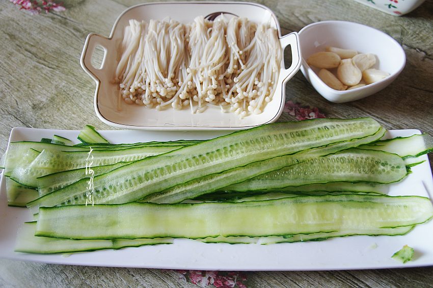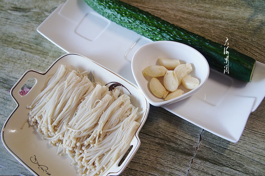 准备食材:食材很简单,大蒜去皮洗净,黄瓜不要去皮,清洗后用面粉搓一遍,然后反复清洗干净。金针菇切掉根部,冷水浸泡10分钟,清洗干净。