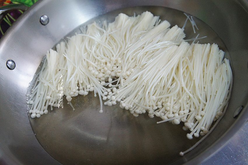 锅中加入适量的水,水开下入清洗干净的金针菇,焯水1分钟。捞出后过冷水,控净水分。金针菇含有人体必需氨基酸成分较全,其中赖氨酸和精氨酸含量尤其丰富,对增强智力尤其是对儿童的身高和智力发育有良好的作用,人称“增智菇”,平时可以多给孩子吃这菜。