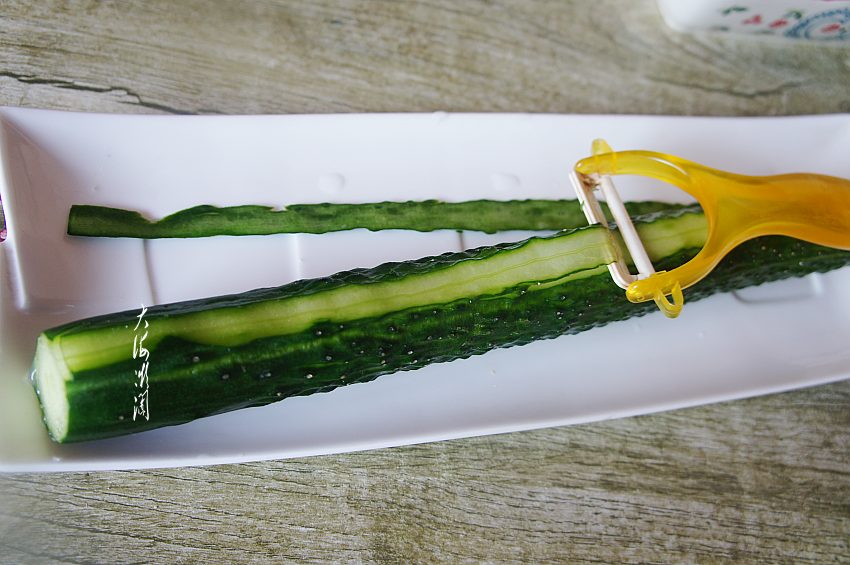 黄瓜用刨皮器刮出薄薄的黄瓜片,需要掌握好力度,薄厚均匀,从头刮至尾,中间不能断开。