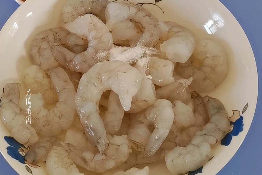 清洗干净的虾仁加入少许盐,适量的料酒腌制5到10分钟左右。