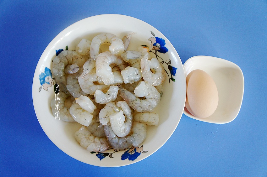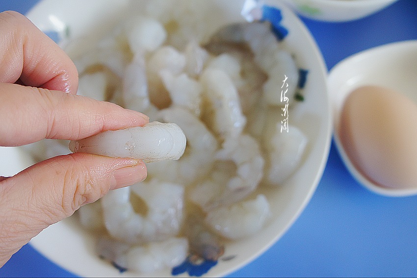 解冻后的虾仁反复清洗干净,再将里外的虾线挑出来,然后再反复清洗干净。