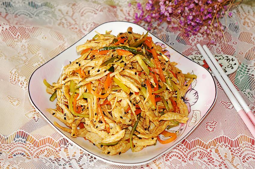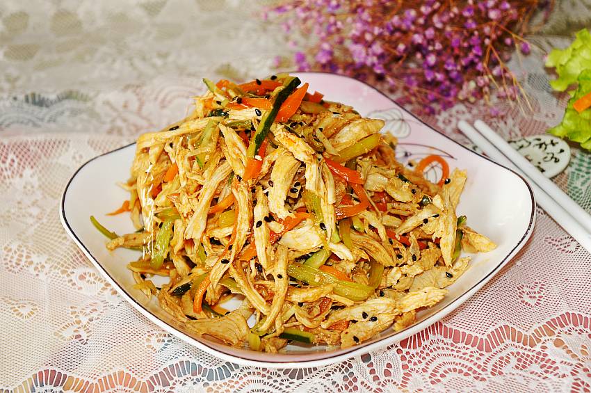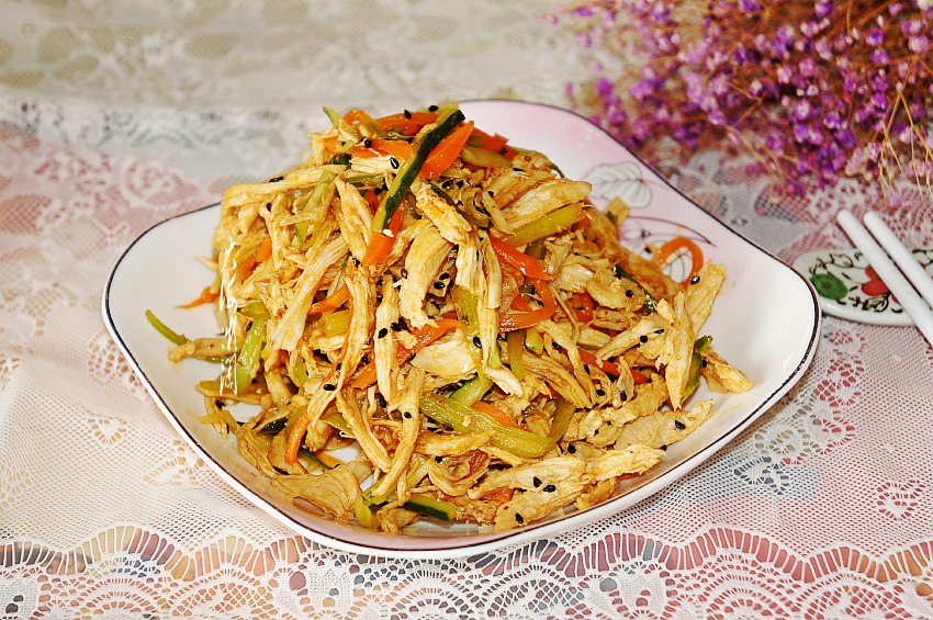 我们家的年夜饭,每年都是4凉8热12道菜,代表一年四季12个月,这4道凉菜可以是熏、酱、泡菜类,其中一道必是爽口凉拌菜,不但清香爽口,最重要的就是用来解腻开胃,下酒下饭。今天这道凉拌菜是我家小朋友最爱吃的一道菜,非常简单好做,特别适合放在年夜饭的餐桌上。欢欢喜喜过大年,一桌丰盛的家宴必不可少,大厨们各种煎炒烹炸,总是忙得不亦乐乎,这道凉拌菜就可以不劳大厨动手,厨房小白也能做得很好吃,只要准备一块鸡胸肉就好,其它配菜随意,鸡胸肉煮熟撕成条一拌,一道爽口又开胃的凉拌菜就OK了,没有比它更简单的凉拌菜了,不瞒您说,这道菜是我家小朋友的拿手菜。
