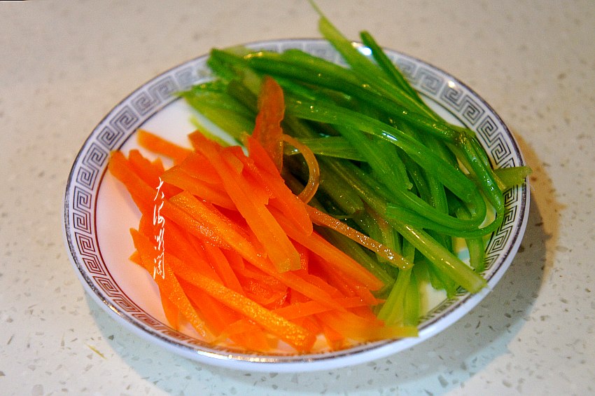 芹菜改刀成芹菜丝,胡萝卜改刀成胡萝卜丝。